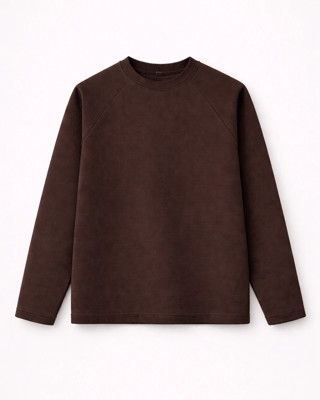 The Brown Structured Terry Long Sleeve is designed for everyday wear with a premium feel. The rich brown tone adds depth, while the structured silhouette keeps the look clean and intentional. Crafted from soft terry fabric, it delivers a smooth outer surface with a comfortable inner feel. The raglan sleeve construction allows natural movement while maintaining a sharp shoulder line. A balance of comfort and structure, made for effortless layering or standalone wear.
