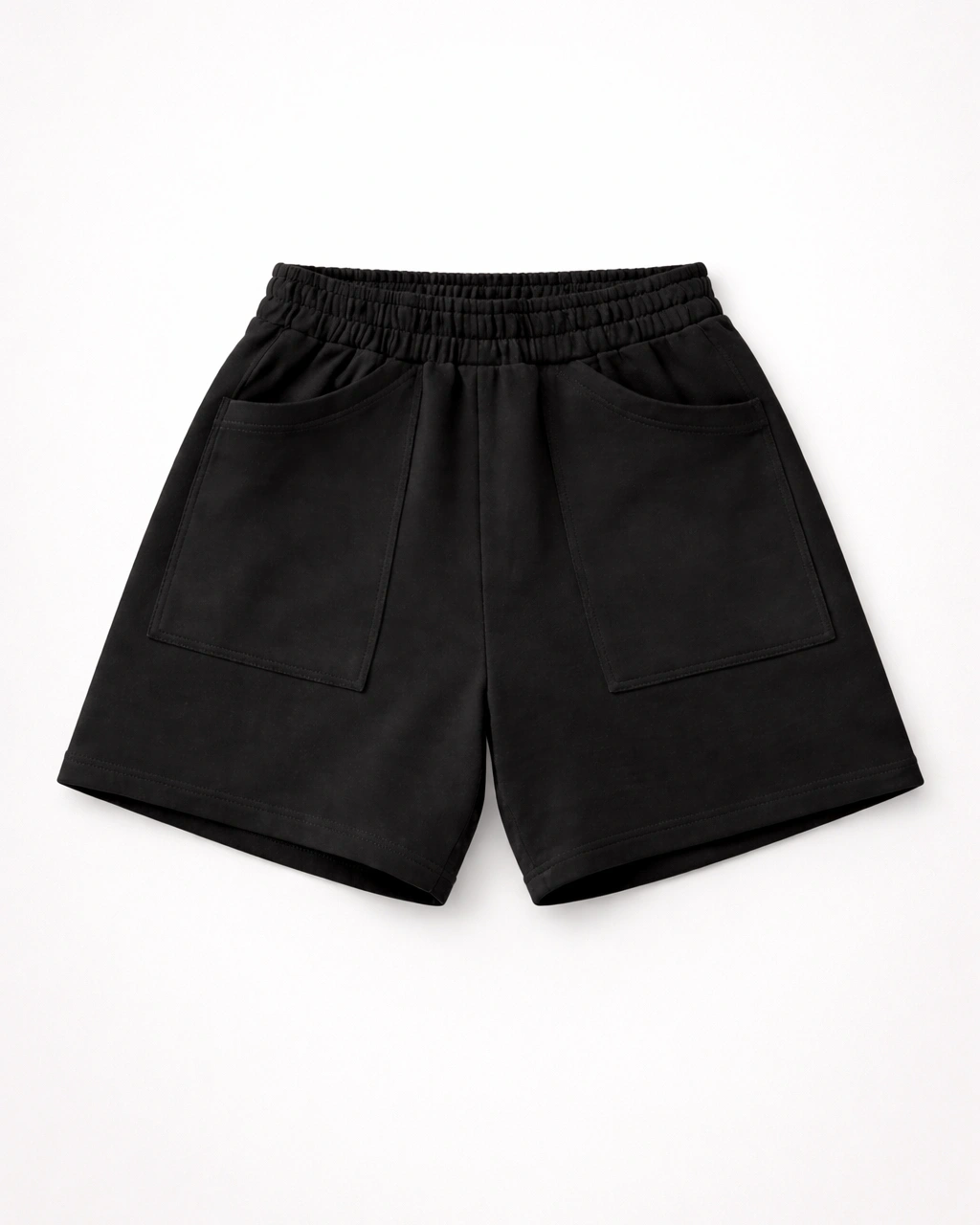 The Black Structured Terry Shorts are built for everyday wear with a clean, minimal look. Designed with a relaxed fit, they offer comfort without losing structure. Crafted from soft terry fabric, they provide a smooth outer feel with a comfortable interior. The elastic waistband ensures an easy fit, while the oversized front pockets add both function and visual balance. A reliable essential that works across casual, lounge, and daily wear.
